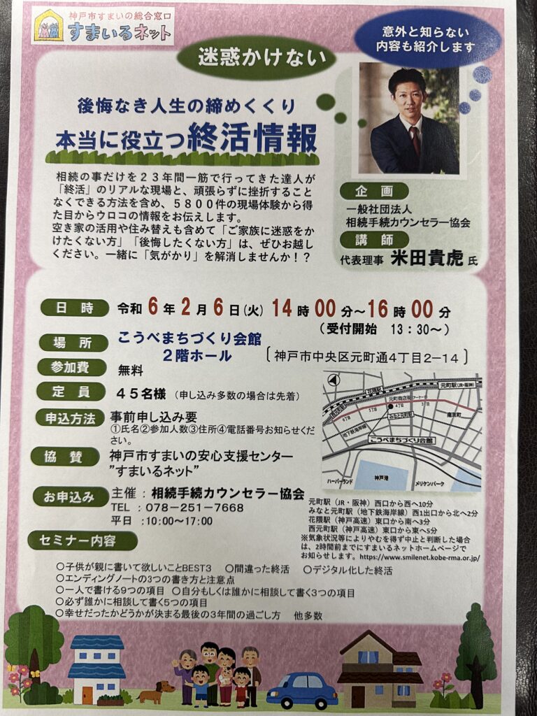 2月6日(火)に神戸市のすまいるネット様協賛で終活セミナーを開催します。いつも... -