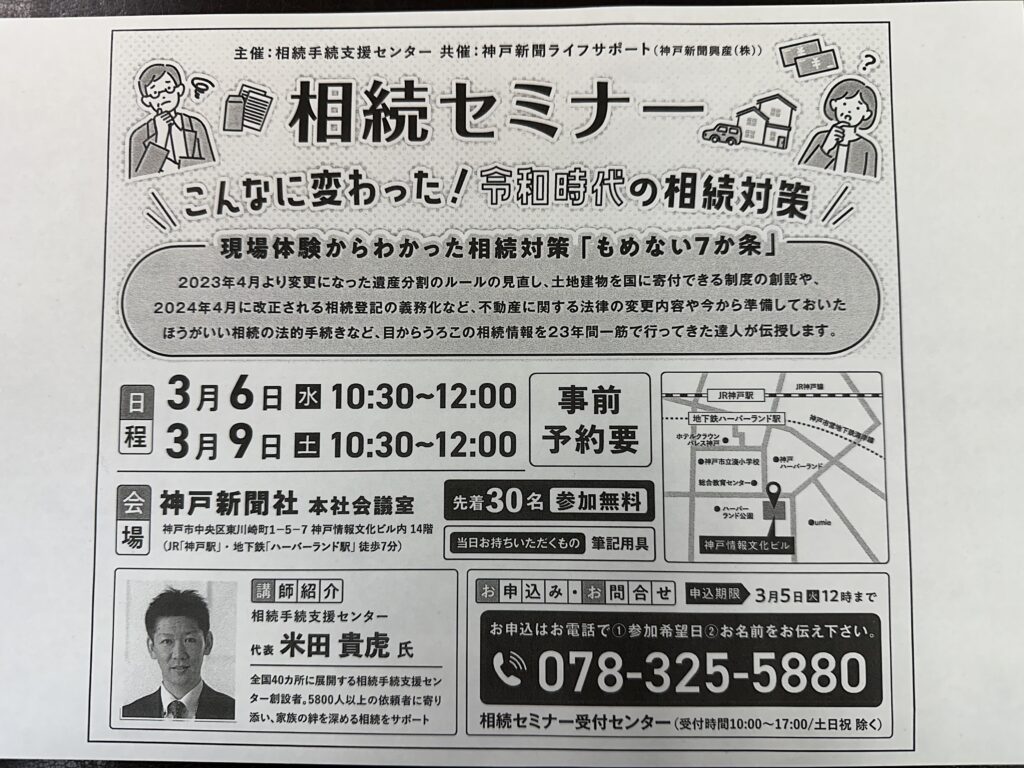 3月6日(水)9日(土)に神戸新聞ライフサポート様共催で相続セミナーを開催し... -