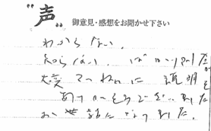 朝来市:大変ていねいに説明をありがとうござい ました 2025 9/22 ご相談者の声 2025.09.22 わからない、知らない、ばかりでしたが、大変ていねいに説明をありがとうござい ました。お世話になりました。 【お客様の声 NO.1055】 ご相談者の声 あなたやご家族は大丈夫? もしも遺言書がなかったら・・・ 西宮市:総合病院の総合受付のよう 関連記事 神戸市灘区:ていねいに相談にのっていただいて、大へん感謝してます 2024.03.26 神戸市東灘区 2020.09.03 三木市 2020.01.29 三木市 2019.10.26 神戸市灘区 2019.10.24 神戸市須磨区 2020.10.12 豊岡市 2020.11.30 宝塚市:説明もわかりやすく安心致しました 2021.03.14
