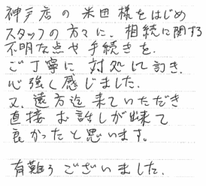 豊岡市:相続に関する不明点や手続きをご丁寧に対応して頂き心強く感じました 2025 12/01 ご相談者の声 2025.12.01 神戸店の米田様をはじめスタッフの方々に、相続に関する不明点や手続きをご丁寧に 対応して頂き、心強く感じました。又、遠方迄来ていただき直接お話が出来て良かった と思います。有難うございました。 【お客様の声 NO.1058】 ご相談者の声 三木市:どなたか相続で悩んでおられたら紹介したいくらいです 法定相続分だけが全てではない! 遺産分割協議のあり方とは? 関連記事 神戸市灘区 2020.04.23 神戸市北区:御相談して良かったと思っています 2024.03.26 神戸市西区 2021.02.02 神戸市垂水区 2019.01.02 南あわじ市 2021.02.25 三木市 2019.11.01 神戸市垂水区:少しはっきりしたので、先へ進めそうです 2024.10.29 明石市:自分がどう行動すればよいのかが見えました 2022.09.21