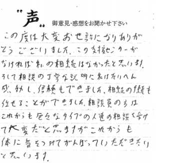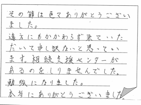 この度は、大変お世話になりありがとうございました。相続で悩んでいた時に、支援センターからお手紙を頂き、御相談に伺いました。親切にアドバイスを頂きスムーズな対応で無事に終えることができました。本当にありがとうございました。