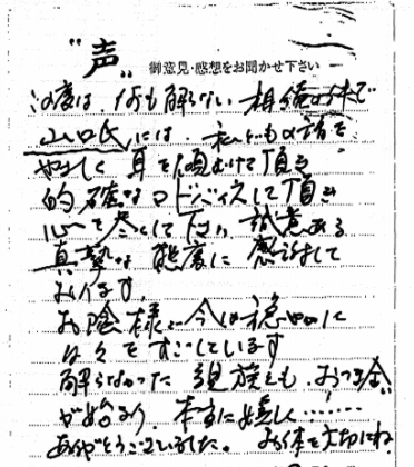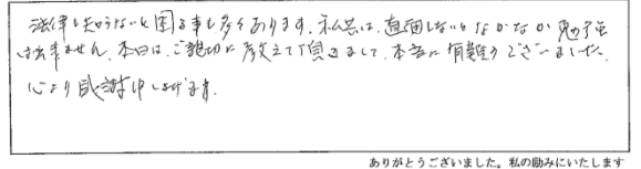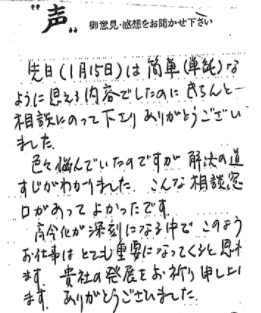 この度は、心温かいお言葉をいただき、本当にありがとうございました。何をどうすればよいか、どこへ相談すればよいのだろうかと夜も寝付かれぬ日々が続いておりましたが、再度のご案内に勇気が出てお伺いいたしました。色々とアドバイスを頂き、昨夜は久し振りにホッといたしました。これからも色々な問題が出て来ることと思いますが、よろしくご指導頂けますようお願いいたします。時節柄ご自愛下さいまして益々のご活躍をお祈り申し上げます。ありがとうございました。