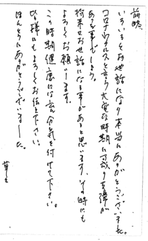 先日は大変お世話になりながらお礼状が大変遅くなり申し訳ございません。雑事にとりまぎれ株式証券の処理は未だ完了していませんが、お教えいただいた要領でボツボツと取り組みたいと思います。何をどの様にすればいいのか全くわからない私共に親切にご指導下さり厚くお礼申し上げます。