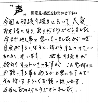 神戸市垂水区 2021 3/04 ご相談者の声 2019.04.17 度々のお便り有難う御座いました。 葬儀後の手続一覧表を参考にさせて戴き娘が頑張って、私はうろうろ するだけでしたが銀行関係、家屋等相続手続をおおかた終える事が出 来ました。有難う御座いました。 【お客様の声 NO.97】 ご相談者の声 神戸市西区 神戸市北区 関連記事 神戸市長田区 2019.03.12 神戸市兵庫区 2020.06.17 神戸市須磨区 2020.07.06 小野市 2019.11.19 神戸市東灘区 2020.10.16 芦屋市 2019.06.26 小平市 2021.01.14 神戸市東灘区:色々新しいことが見えてきました 2024.10.29