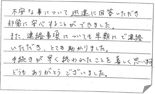 現在は順調に手続きを進めておりますが、いただいたアドバイスは、大きな励み