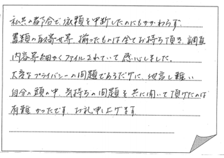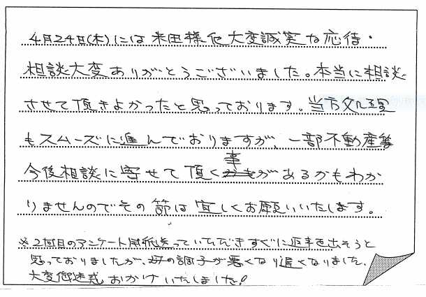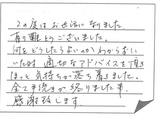 2件の相談をさせていただいた所、誠に親切にアドバイスを頂き、ひとつひとつ手続