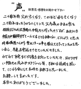 万一の場合に御相談出来る貴センターを知る事が出来、一安心致しました。定時を過