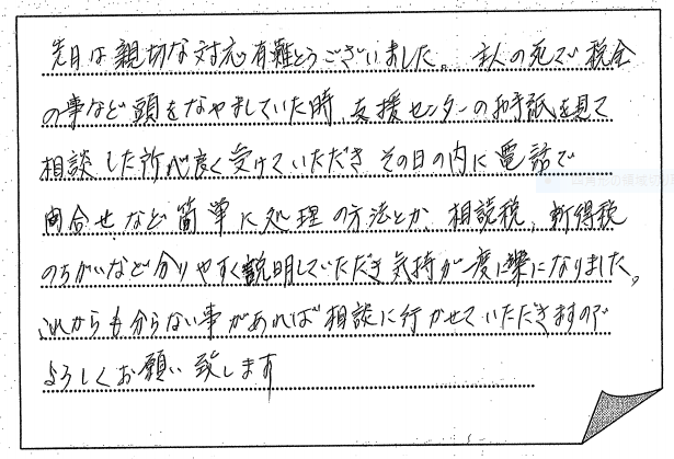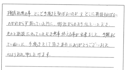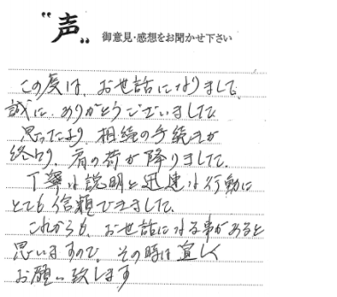 神戸市須磨区 2021 3/04 ご相談者の声 2020.04.28 今回はこちらにお世話になり、ホッと肩の荷が下りたような安心感があり本当に助か りました。 【お客様の声 NO.508】 ご相談者の声 神戸市北区 三田市 関連記事 奈良市 2019.12.15 神戸市須磨区 2019.02.08 神戸市垂水区 2019.03.08 奈良県大和郡山市 2020.05.18 吹田市:親切に教えて頂き、ありがとうございました 2022.09.21 神戸市:長年の懸案が解決したことにホッとしています 2024.11.09 加古川市 2020.01.15 姫路市 2019.03.07