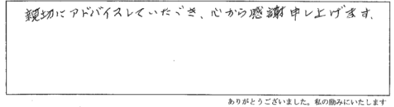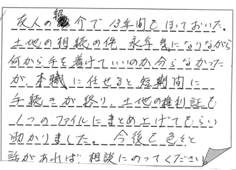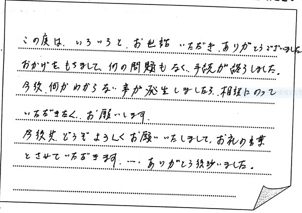 ました。相続手続きをスムーズに完了して頂き、現在、その開放感に浸っておりま