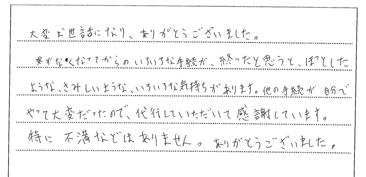 西宮市 2021 3/04 ご相談者の声 2020.06.12 この度は大変お世話になりありがとうございました。とても親切にわかりやすく説 明していただき、無事手続きも終了し感謝しております。又、何かありましたら、御相 談にのっていただきたく思います。よろしくお願いいたします。 【お客様の声 NO.552】 ご相談者の声 神戸市東灘区 豊中市 関連記事 神戸市北区 2020.01.10 神戸市兵庫区:相談を心よくして頂き、うれしいです 2022.04.02 神戸市須磨区 2019.10.09 三田市:たいへんなお仕事だと感謝しております 2024.02.27 神戸市西区 2019.05.24 神戸市東灘区 2019.07.28 姫路市:自分の知らなかった事をおしえていただき大変良かったです 2025.05.01 明石市:こんなにも早くスムーズに終わりましたこと、本当にびっくりです 2021.03.18