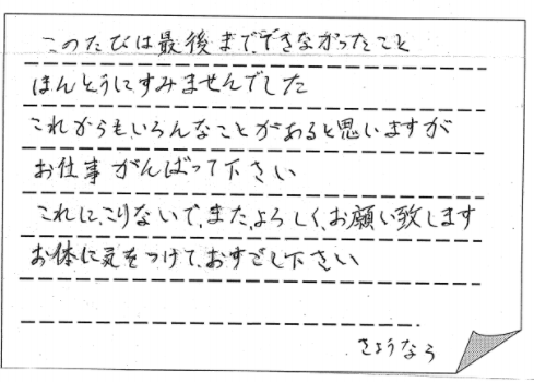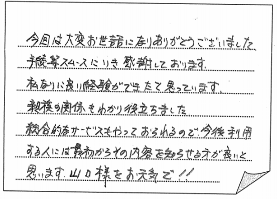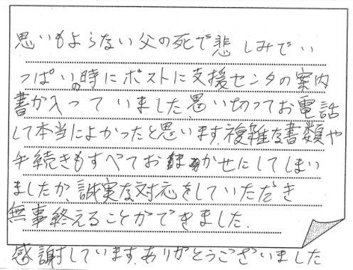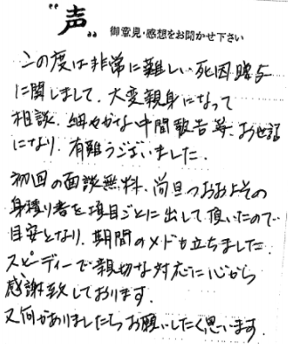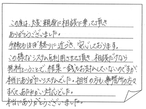 神戸市西区 2021 3/04 ご相談者の声 2020.07.22 担当の山口さんから当方の質問事項に丁寧に答えて頂き、充分理解出来ました。 相続税の申告不要と聞き安心しました。 登記でお世話になると思いますが、よろしくお願いします。 【お客様の声 NO.592】 ご相談者の声 明石市 路線価上昇、税負担ずしり ~コロナで価格急落、取引が停滞~ 関連記事 三田市 2020.02.19 明石市 2019.12.16 神戸市灘区:無事手続きが終りほっとしています、有難うございました 2022.09.21 三木市 2020.01.15 神戸市北区:最も知りたいことにわかりやすく答えていただきました 2024.05.11 三木市 2019.05.15 神戸市須磨区:丁寧に対応していただき、ありがとうございました 2025.05.28 明石市 2019.06.24