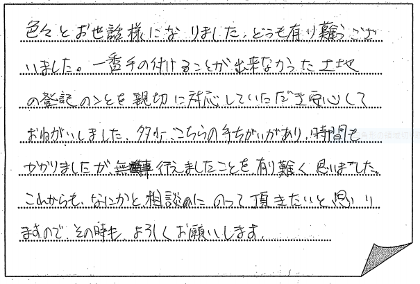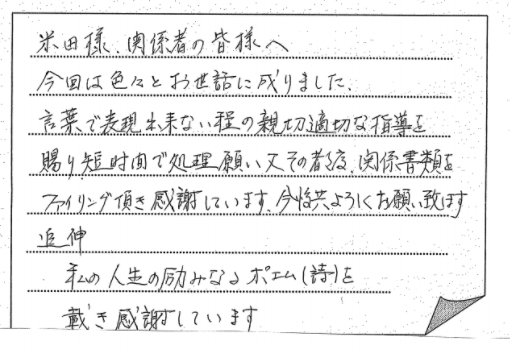 この度は相続の手続きにご尽力頂きまして感謝の気持ちで一杯です。本当にありがと