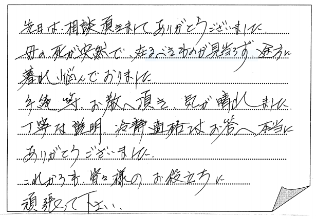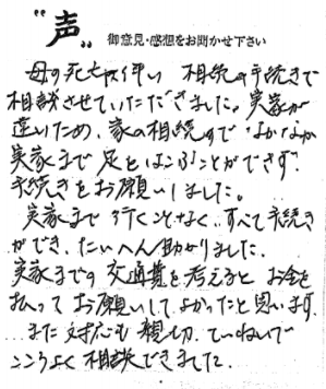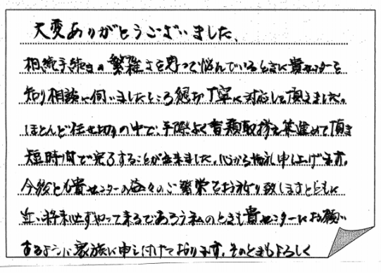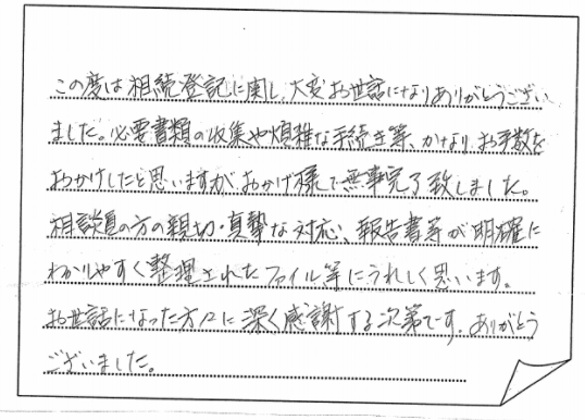 この度は相続の手続きにご尽力頂きまして感謝の気持ちで一杯です。本当にありがと