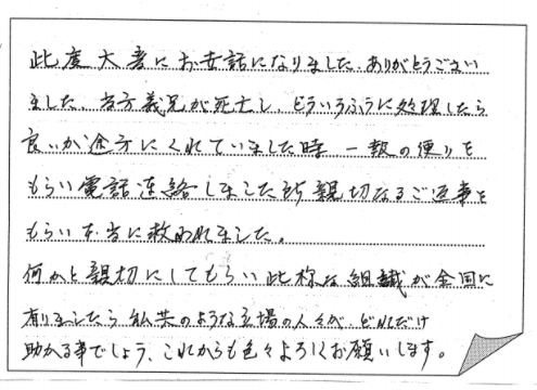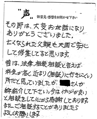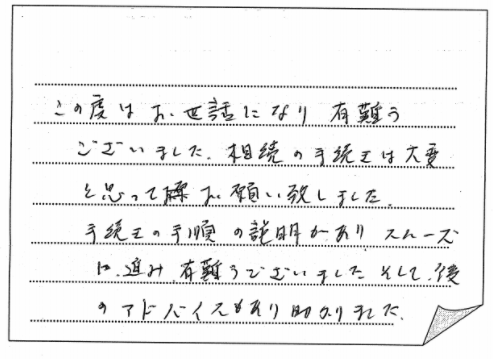 養父市 2021 3/04 ご相談者の声 2020.12.04 大変お世話になりました。ありがとうございました。 相続手続支援センターのこと、もっと早く知ってたら、 いろいろ思い悩むことなかったのになあと思います。 【お客様の声 NO.734】 ご相談者の声 浜松市 神戸市北区 関連記事 三田市 2020.04.29 神戸市垂水区 2020.03.06 茨木市 2020.03.29 神戸市東灘区:気になっている事が片づいたのでホットしています 2022.04.02 神戸市長田区 2020.03.13 神戸市灘区 2019.09.18 神戸市兵庫区 2020.09.15 神戸市長田区 2019.11.27