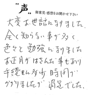 神戸市須磨区 2021 3/05 ご相談者の声 2021.02.01 とても不安でしたが何とか自分で出来そうな気がしました。 本当にありがとうございました。 【お客様の声 NO.796】 ご相談者の声 神戸市灘区 神戸市西区 関連記事 三田市 2020.05.09 尼崎市:説明が分かりやすく質問もていねいに教えていただき参考になりました 2024.10.29 西宮市:とてもテキパキと明確に答えて頂き参考になりました 2021.03.15 神戸市須磨区 2020.03.14 神戸市垂水区:お陰様で今は穏やかに日々をすごしています 2020.02.05 神戸市垂水区 2019.09.17 加西市 2019.05.11 明石市 2021.02.18