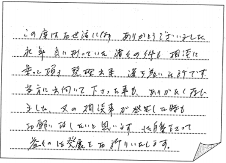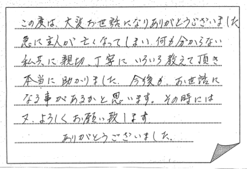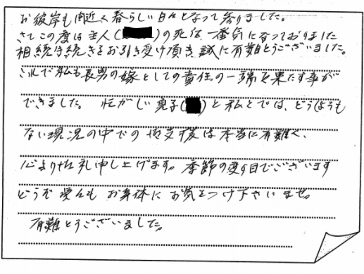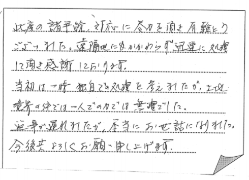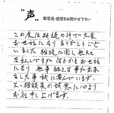 神戸市長田区 2021 3/08 ご相談者の声 2021.03.03 親切、ていねいに話を聞いてもらい、多大なアドバイスを頂き感謝しております。 本当に有難うございました。 【お客様の声 NO.826】 ご相談者の声 宍粟市 神戸市中央区 関連記事 小野市 2019.11.19 神戸市須磨区 2020.12.01 神戸市東灘区 2019.07.28 神戸市垂水区 2019.10.02 南あわじ市:一連の手続きを全ておまかせでき、心強かったです 2024.11.09 神戸市兵庫区 2019.05.12 三田市 2019.05.05 神戸市西区:詳しい説明で明確に理解でき安心いたしました 2022.09.21