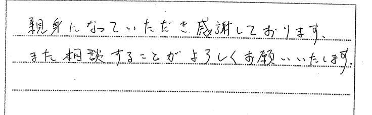 西宮市:とてもテキパキと明確に答えて頂き参考になりました 2025 2/21 ご相談者の声 2021.03.15 とてもテキパキと明確に答えて頂き参考になりました。明るくお話していただいて、 とても元気が出ました。これからも相談時、お願いしたいです。ありがとうございま した。 【お客様の声 NO.838】 ご相談者の声 宝塚市:説明もわかりやすく安心致しました 姫路市:過日は大変お世話になり本当にありがとうございました 関連記事 加東市 2019.08.18 明石市 2020.07.29 姫路市:過日は大変お世話になり本当にありがとうございました 2021.03.16 神戸市:手続きをスムーズに処理して頂き、ありがとうございました 2025.11.06 神戸市垂水区:親身になっていただき感謝しております 2026.02.17 三田市 2020.04.29 豊中市 2020.06.13 芦屋市 2020.02.11
