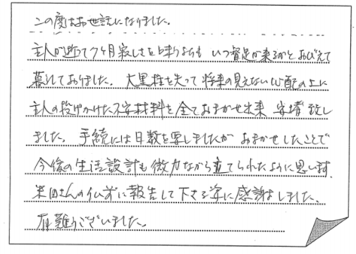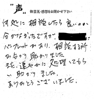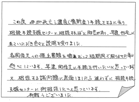 明石市:ていねいに教えて頂きました 2024 2/06 ご相談者の声 2021.04.03 ていねいに教えて頂き、ありがとうございました。不明な事があれば、連絡させ て頂きます。 【お客様の声 NO.857】 ご相談者の声 来店予約 地銀も続々 ~高齢者支援のサブスク~ 芦屋市:すべきことの方向性がわかりました 関連記事 明石市 2020.09.30 神戸市長田区 2020.10.15 京都府八幡市 2020.11.07 神戸市灘区 2019.06.15 神戸市西区 2019.02.27 明石市 2019.12.13 美嚢郡吉川町 2019.06.04 西宮市:初めての面談から気持ちよく接して貰え、気持ちが落ち着きました 2021.03.13