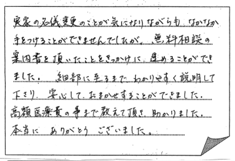 伊丹市:とても良かったです 2024 2/06 ご相談者の声 2021.04.08 相続についての説明がわかるように話していただいたのがとても良かった です。 【お客様の声 NO.863】 ご相談者の声 神戸市長田区:具体的な話が聞けて理解が深まりました 吹田市:疑問点を解消できました 関連記事 神戸市西区 2019.03.02 朝来市:大変ていねいに説明をありがとうござい ました 2025.09.22 東京都武蔵野市:感謝申し上げます 2021.03.27 三木市 2019.01.23 神戸市垂水区 2020.07.04 西宮市 2020.06.25 神戸市 2020.02.23 京都府相楽郡 2020.09.10