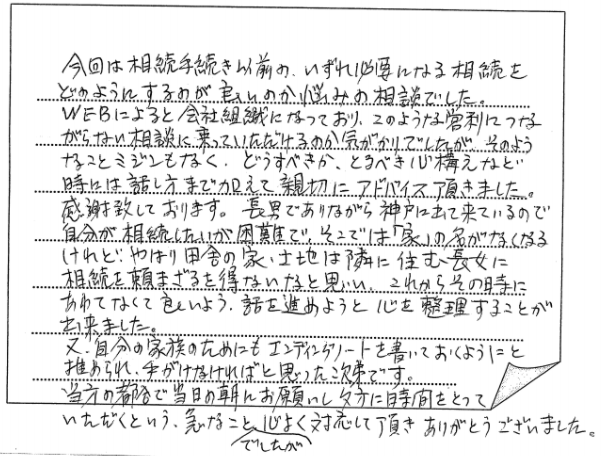 神戸市:ていねいな説明、早く手続きしていただきありがとうございます 2024 12/09 ご相談者の声 2022.09.21 ていねいな説明 早く手続きしていただきありがとうございます。 【お客様の声 NO.907】 ご相談者の声 神戸市北区:悩んでいた問題の解決に一応目途がついたように思います 明石市:自分がどう行動すればよいのかが見えました 関連記事 加古川市 2019.06.05 明石市 2020.01.17 三木市 2021.01.02 神戸市西区:ありがとうございました。 2025.07.10 明石市 2019.12.13 神戸市垂水区 2019.01.29 枚方市 2021.03.01 神戸市:参考になりました 2025.08.04