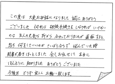 神戸市中央区:ていねいに説明して下さり有難うございました 2024 12/04 ご相談者の声 2024.07.10 ていねいに説明して下さり有難とうございました。 【お客様の声 NO.999】 ご相談者の声 神戸市垂水区:こんなにスムーズに行くとは思っていませんでした 神戸市西区:ていねいに疑問点等を解答していただき、よくわかりました 関連記事 三木市 2020.09.18 神戸市東灘区 2019.08.16 明石市 2019.05.13 神戸市長田区 2019.01.19 神戸市東灘区:ていねいな説明でよくわかりました 2023.11.16 神戸市西区:面倒な手続きをすべて対応していただきました 2024.07.10 加古川市 2020.05.20 三木市 2020.01.29