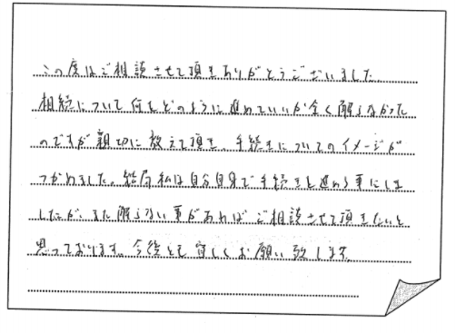 大阪市:ありがとうございました 2024 10/16 ご相談者の声 2024.10.16 ありがとうございました。 【お客様の声 NO.1013】 ご相談者の声 西宮市:戸籍の集め方、不動産の名義変更についてなど不明な点が分かってよかった 神戸市東灘区:将来の対応の考え方を含めて、非常に参考になりました 関連記事 神戸市西区 2020.03.20 神戸市須磨区 2020.03.14 神戸市垂水区 2020.03.06 宝塚市 2019.05.03 神戸市北区 2019.12.05 川辺郡猪名川町 2019.12.17 神戸市北区:最も知りたいことにわかりやすく答えていただきました 2024.05.11 神戸市長田区 2020.01.02
