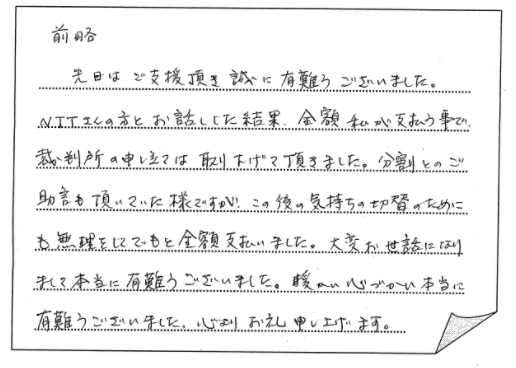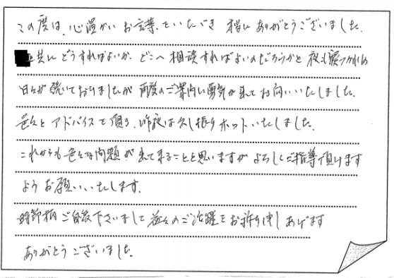 神戸市灘区:初めての事なので、大変参考になりました 2024 12/04 ご相談者の声 2024.11.09 本日は、ありがとうございました。初めての事なので、大変参考になりました。 また、別の事でお世話になる事があるかもしれませんが、その時は、よろしく お願いします。 【お客様の声 NO.1022】 ご相談者の声 南あわじ市:一連の手続きを全ておまかせでき、心強かったです 神戸市東灘区:安心して日々暮せることにうれしくて感謝します 関連記事 神戸市東灘区 2020.05.04 神戸市西区:参考になりました 2025.09.03 神戸市東灘区 2021.03.07 明石市 2021.02.07 加古川市:専門家の方々のお力をお借りできて安心でした 2021.03.25 大阪府:本当にありがとうございました 2021.03.24 神戸市中央区 2019.10.01 神戸市垂水区 2021.02.11