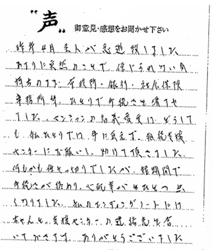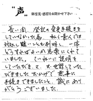 明石市:親切にアドバイスしていただき大変助すかりました 2025 3/14 ご相談者の声 2025.03.14 両親が連続で亡くなり相続手続きが大変ですが、親切にアドバイスしていた だいたので、大変助すかりました。 【お客様の声 NO.1026】 ご相談者の声 神戸市兵庫区:ありがとうございました 神戸市:こうして今を迎えられているのも、ご協力があってのものだと感じております 関連記事 神戸市垂水区 2020.07.04 神戸市須磨区 2020.07.06 西宮市 2020.06.25 神戸市 2020.03.02 神戸市西区:手続きの進め方、ポイントがよくわかりました 2025.03.18 三木市 2019.12.10 尼崎市 2020.06.14 神戸市兵庫区 2021.02.20
