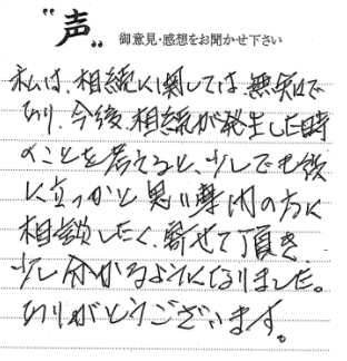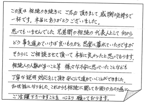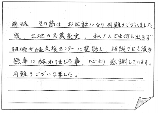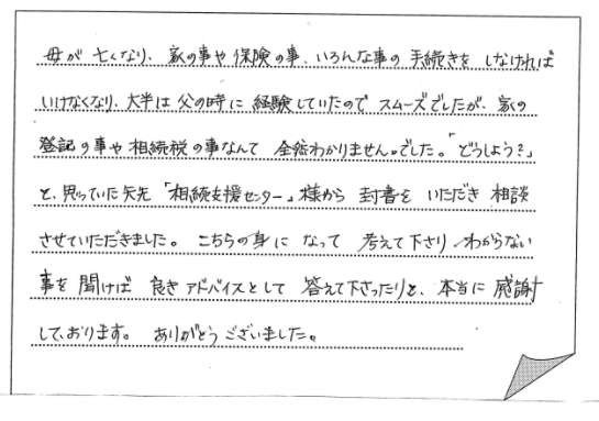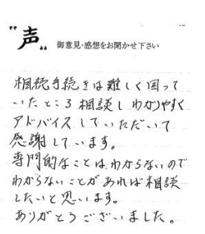 大阪府堺市:親身になって相談に乗っていただき、安心して手続きを進めることができました 2025 4/09 ご相談者の声 2025.04.09 この度は大変お世話になりました。親身なって相談に乗っていただき、安心して手続 きを進めることができました。今後、家を売却する際にも相談させていただきたいで す。ありがとうございました。 【お客様の声 NO.1036】 ご相談者の声 神戸市垂水区:ていねいに対応して下さり感謝しております 一見便利な「リバースモーゲージ」、リスクも想定して! 関連記事 神戸市北区 2021.01.08 大阪府箕面市:相談したいことを明確に答えていただきました 2021.03.17 京都府八幡市 2020.11.07 神戸市垂水区:質問に対して わかりやすく、的確にアドバイスして頂きました 2024.03.26 三木市 2019.01.30 神戸市須磨区 2019.08.03 神戸市西区 2019.08.22 神戸市灘区 2020.08.11