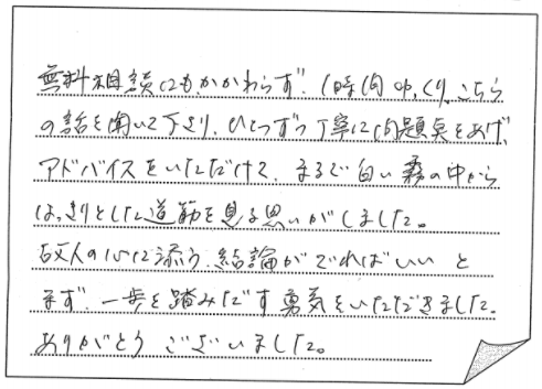 兵庫県揖保郡:色々と話を聞かせて頂き、すこし 安心しました 2025 4/26 ご相談者の声 2025.04.26 相続に対するばくぜんとした不安がありましたが、色々と話を聞かせて頂き、すこし 安心しました。とても参考になりました。 【お客様の声 NO.1039】 ご相談者の声 加古川市:次の話しや進行することが分かったので相談できて良かったです 姫路市:自分の知らなかった事をおしえていただき大変良かったです 関連記事 神戸市兵庫区:大変わかりやすく説明してもらい助かりました 2024.03.26 神戸市西区 2019.02.05 横浜市 2020.11.06 姫路市 2021.03.09 高砂市 2019.10.07 神戸市垂水区 2019.03.08 三木市 2019.05.09 神戸市中央区 2019.08.11