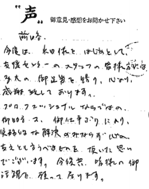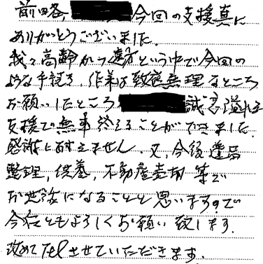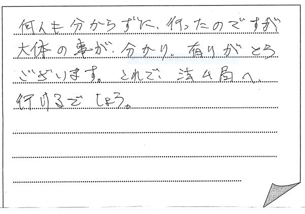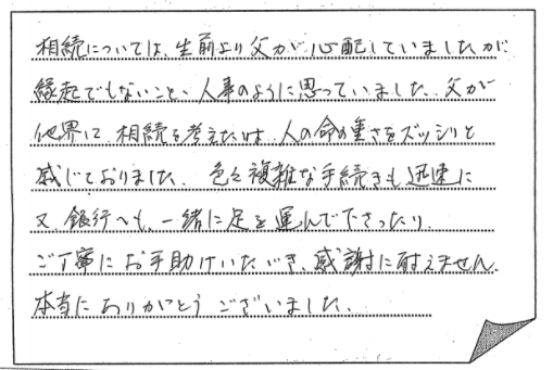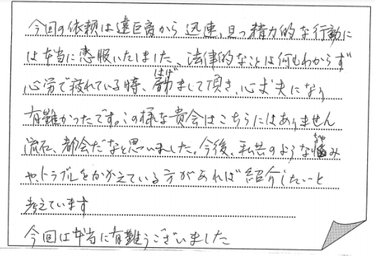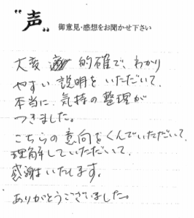 西宮市:迅速に回答いただき非常に安心することができました 2025 6/12 ご相談者の声 2025.06.12 不安な事について迅速に回答いただき非常に安心することができました。 また、連絡事項についても早期にご連絡いただき、とても助かりました。 手続きが早く終われたことを嬉しく思います。 どうもありがとうございました。 【お客様の声 NO.1044】 ご相談者の声 一見便利な「リースバック」、デメリットも把握して! 三木市:とても参考になりました 関連記事 神戸市須磨区:質問させていただいた事項に簡潔に回答いただきました 2023.11.25 神戸市須磨区 2019.08.03 神戸市中央区 2019.09.07 神戸市灘区 2020.01.09 芦屋市 2020.06.28 神戸市垂水区 2020.05.23 神戸市東灘区:気になっている事が片づいたのでホットしています 2022.04.02 神戸市中央区:丁寧に教えていただき不安感がうすれました 2025.04.09