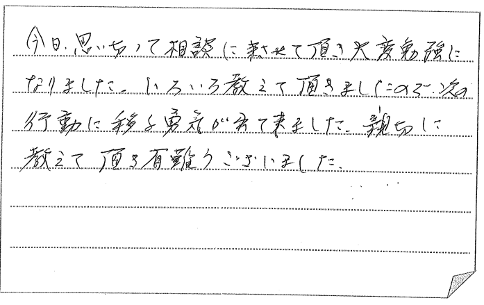 今日、思い切って相談に来させて頂き大変勉強になりました。いろいろ教えて頂きま... -