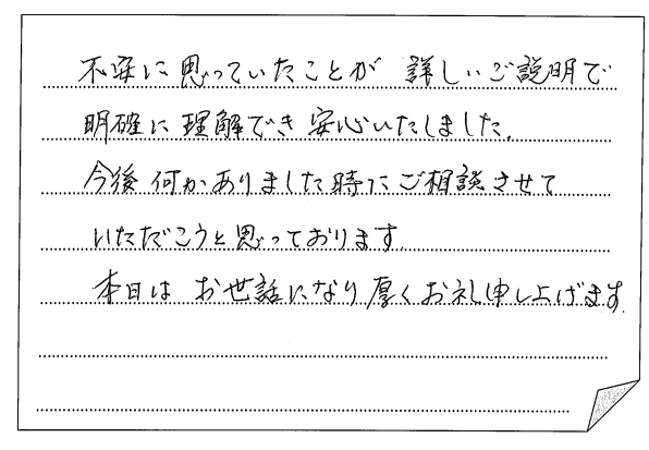 不安に思っていたことが、詳しいご説明で明確に理解でき安心いたしました。今後何...
