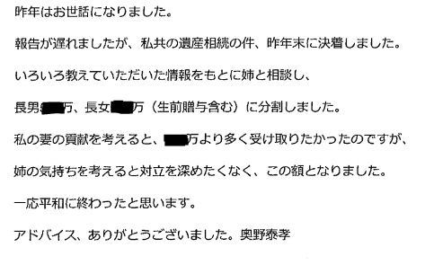 昨年はお世話になりました。報告が遅れましたが、私共の遺産相続の件、昨年末に決... -