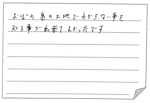 おばの島の土地でわからない事を知る事が出来てよかったです。 ... -