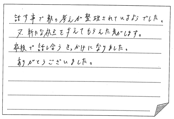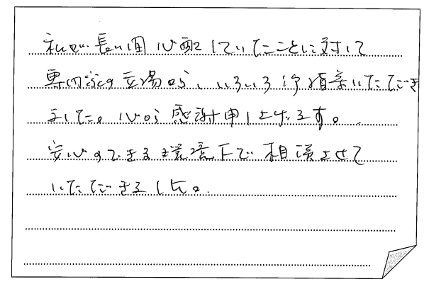 相続の相談をすると、家族関係や財産などの個人情報が知れてしまうので不安でしたが、個人情報の管理を徹底されていると知り、安心しました。