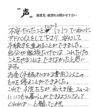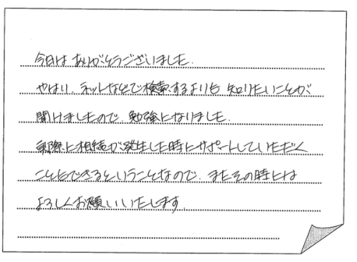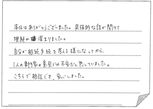 相続の相談をすると、家族関係や財産などの個人情報が知れてしまうので不安でしたが、個人情報の管理を徹底されていると知り、安心しました。