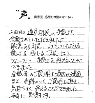 2回目の遺産相続の手続きを依頼させていただきましたが、誠意ある対応、よりそって... -