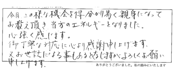 今日この様な機会を得、分かり易く親身になってお教え頂き、当方のエネルギーとな... -
