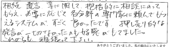 相続遺言等に関して包括的に相談にのってもらえ、必要に応じて各分野の専門家に頼... -