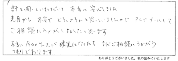 話を聞いていただいて、本当に安心しました。先月から不安でどうしようかと思って... -
