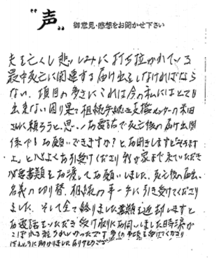 相続の相談をすると、家族関係や財産などの個人情報が知れてしまうので不安でしたが、個人情報の管理を徹底されていると知り、安心しました。