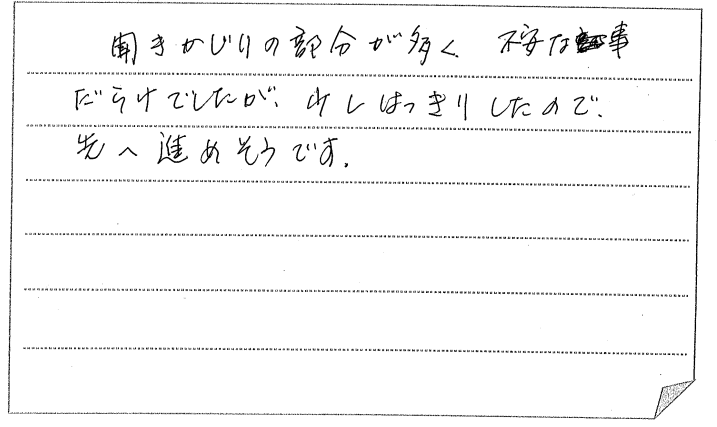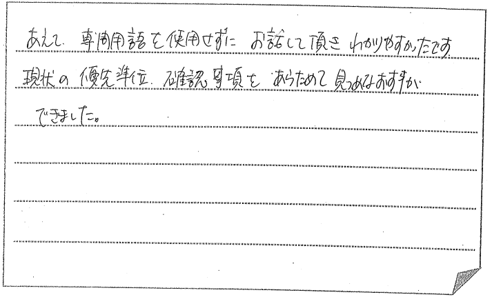難しい法律用語を使わずに、分かりやすい言葉で丁寧に説明していただきました。話しやすい雰囲気でホッとしました。