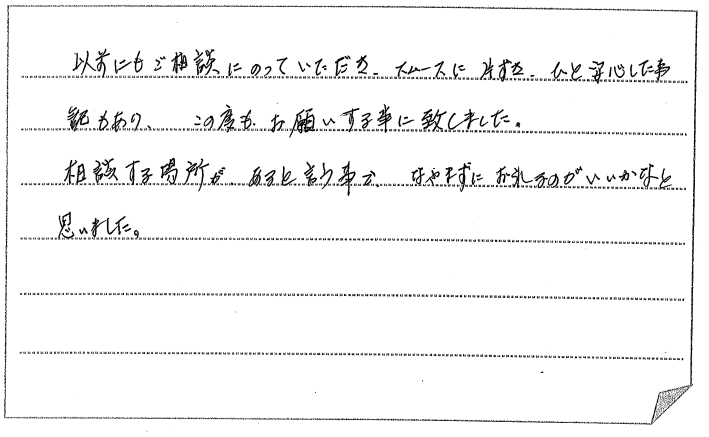 以前にもご相談にのっていただき、スムーズに片づきひと安心した事もあり、この度...