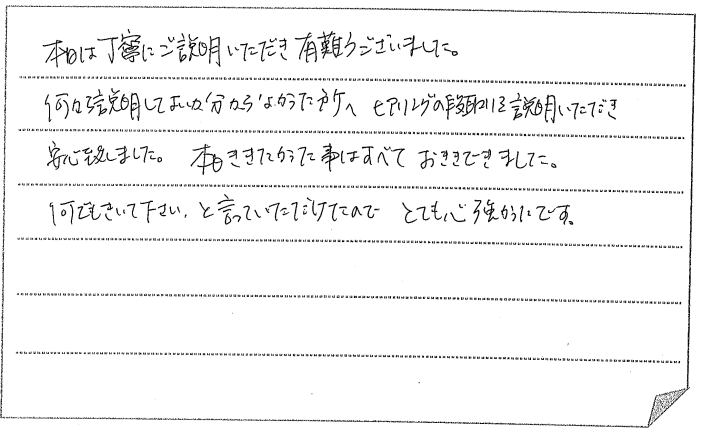 本日は丁寧にご説明いただき有難うございました。何から説明してよいか分からなか... -